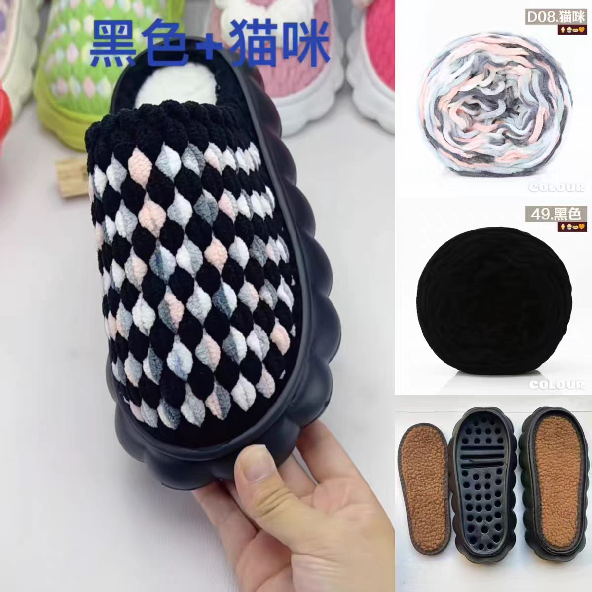 秋冬季情侣手工DIY居家拖鞋材料包钩针冰条线粗毛线方块棉鞋底子