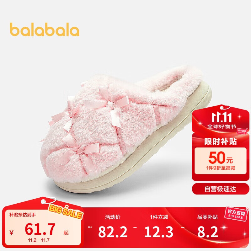 巴拉巴拉棉拖鞋女童宝宝2025新秋冬棉鞋加绒室内家居鞋蝴蝶结208425141026