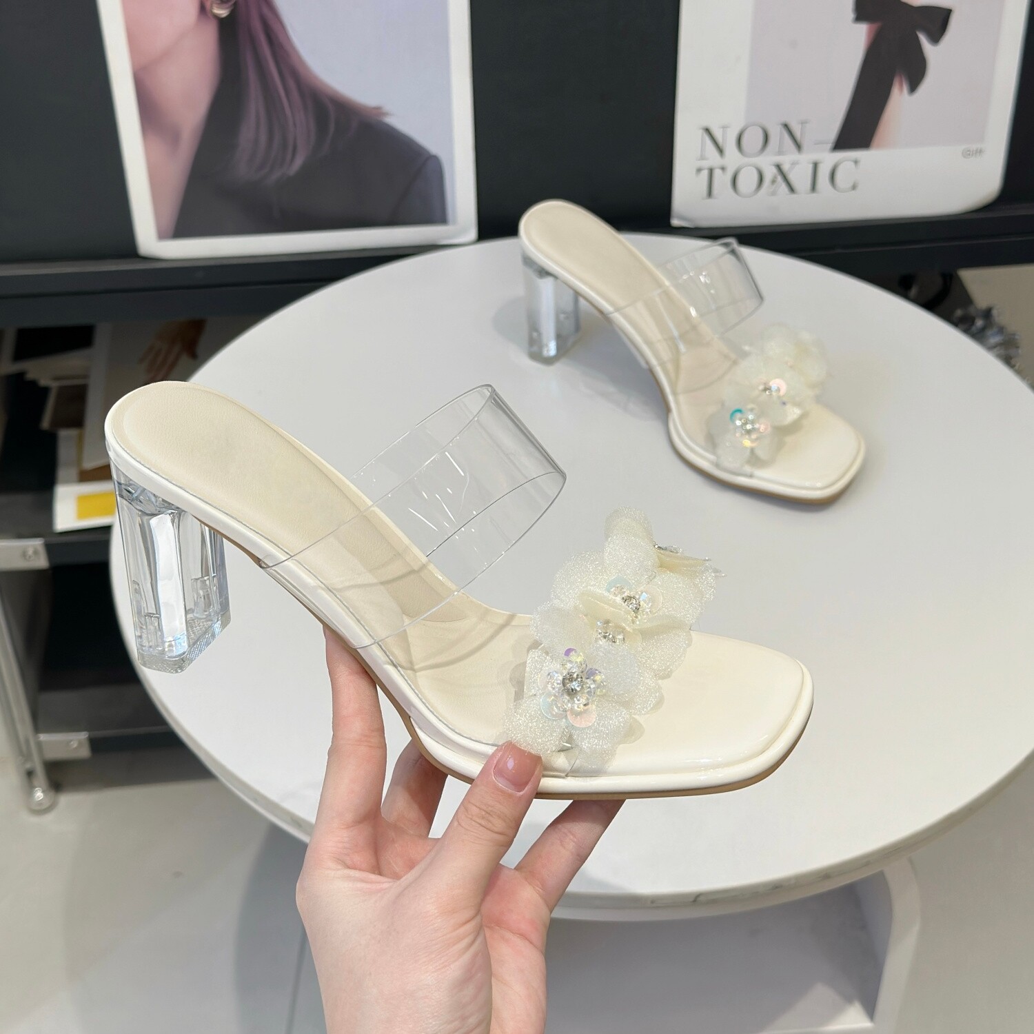 千百度珍珠透明跟一字拖女新款外穿绝美配裙子粗跟凉拖鞋气质百搭