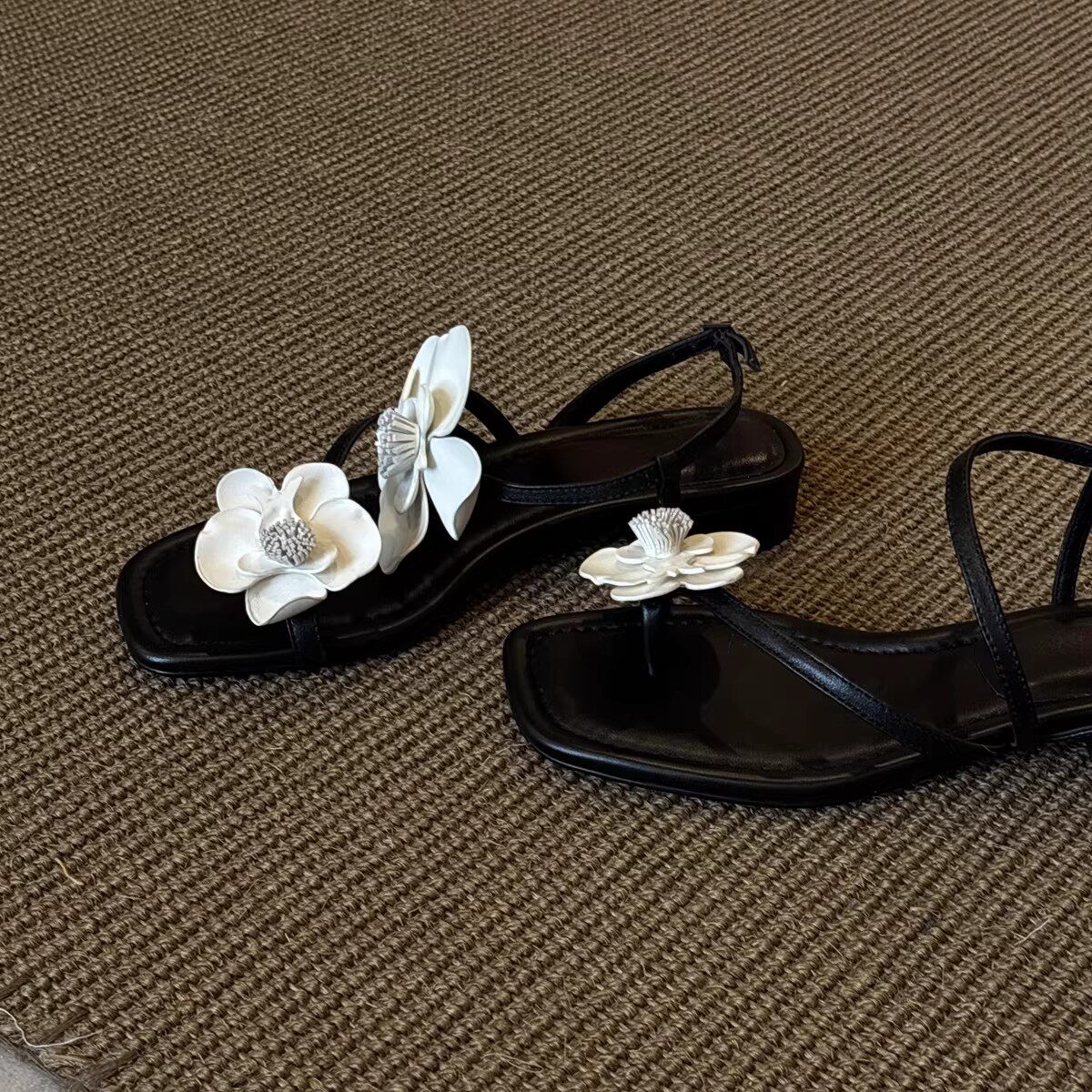 羊皮版~2026年夏季新款小香风露趾方头山茶花一字扣带平底凉拖鞋