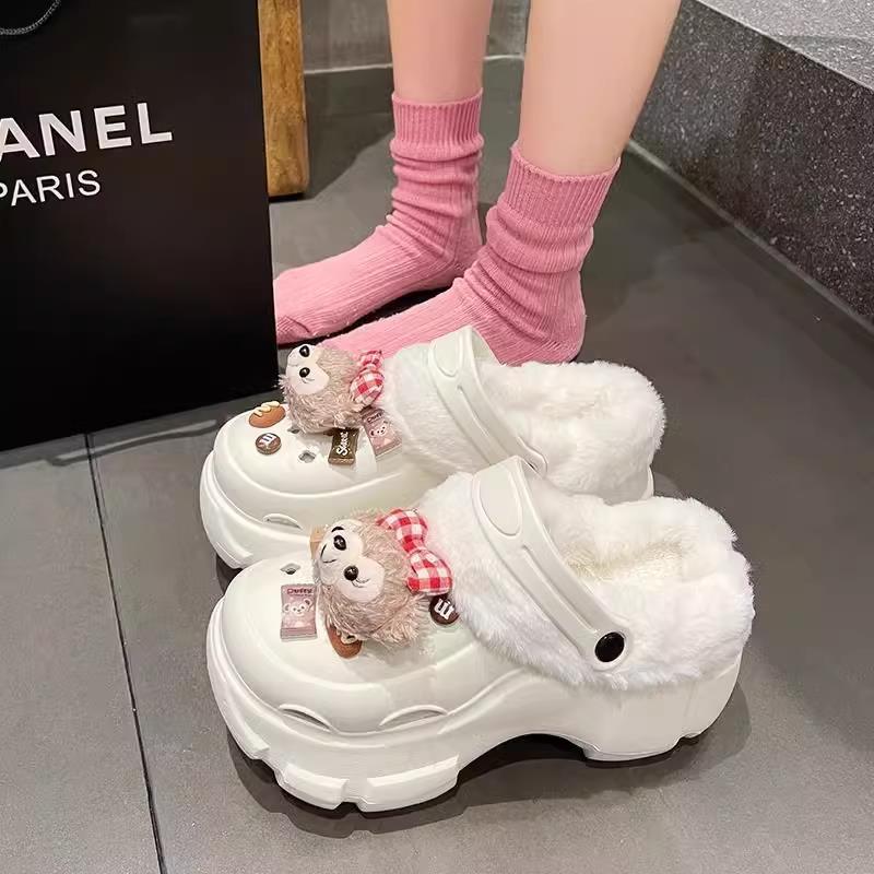 2024新款加绒棉洞洞鞋女冬季外穿保暖增高厚底毛毛棉拖鞋女士冬天