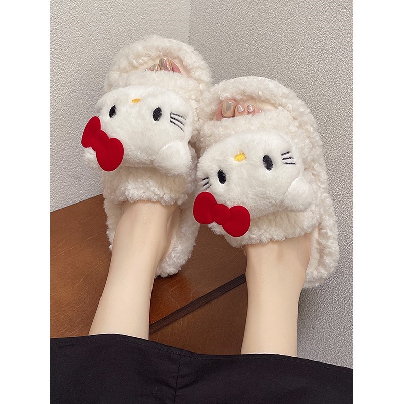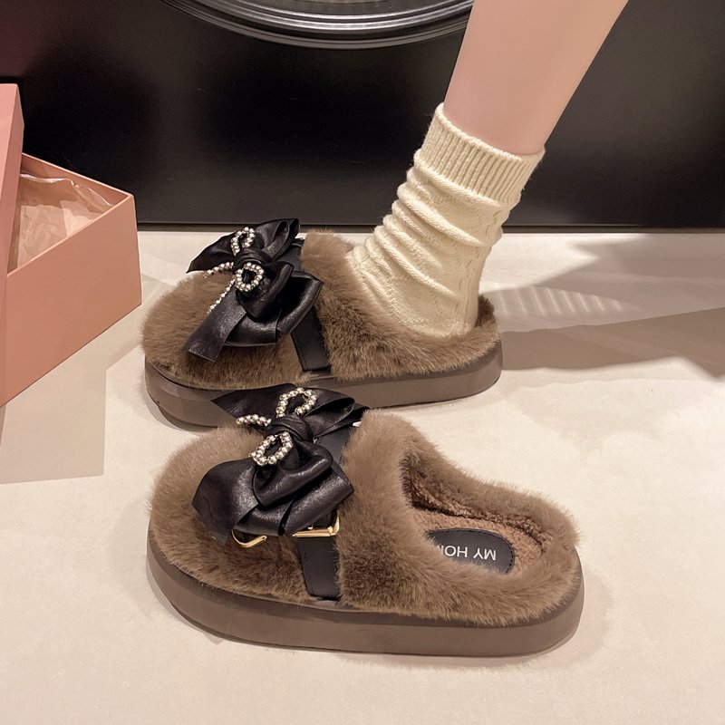 美拉德气质可爱优雅蝴蝶结毛绒绒拖鞋女秋冬季居家加绒软底棉拖鞋
