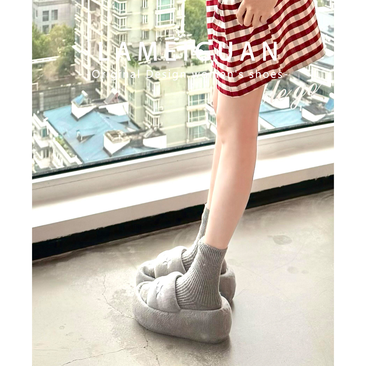 甜美毛毛厚底一字拖鞋女外穿2025秋冬新款灰色防滑保暖加绒棉拖鞋