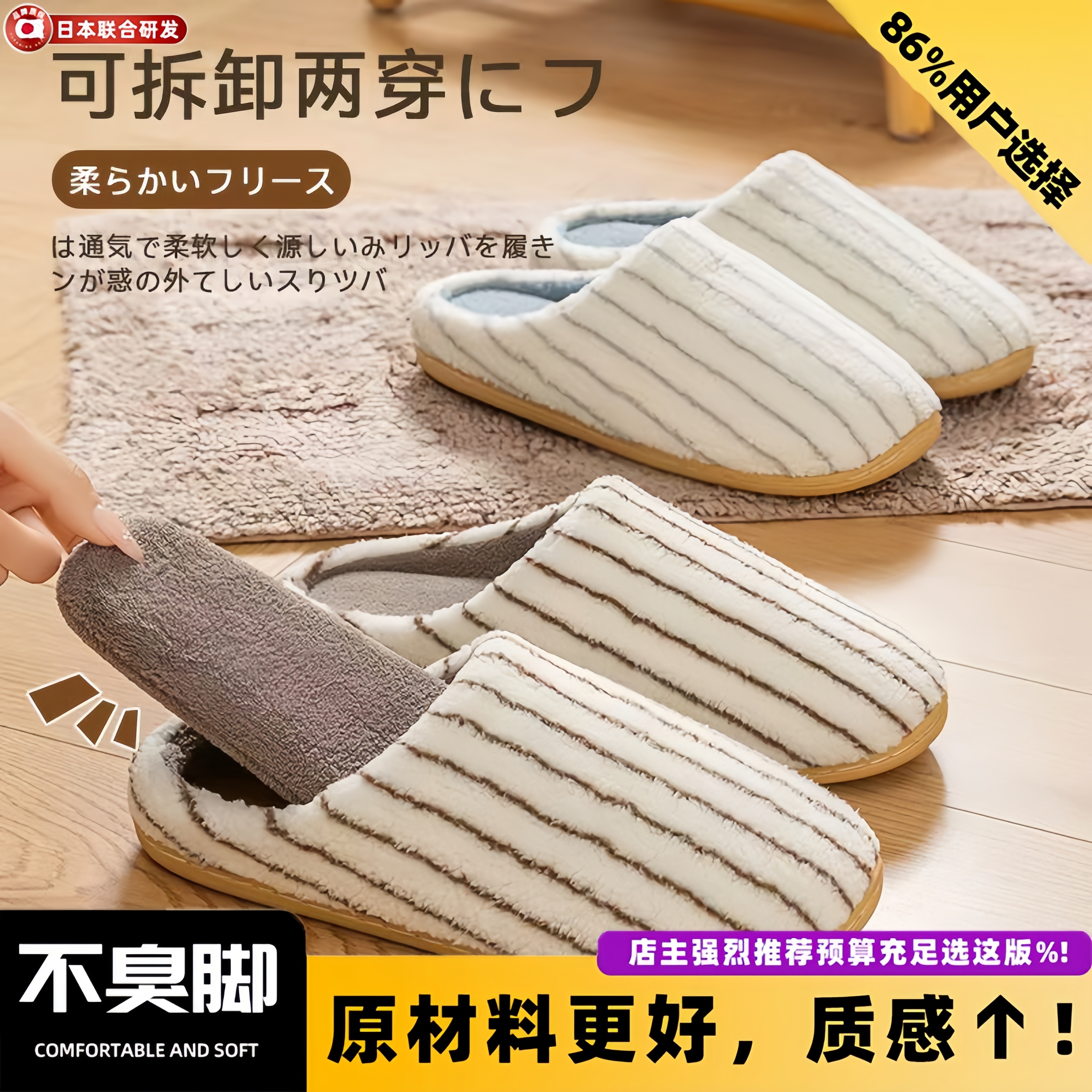 日式可拆卸静音棉拖女秋冬季家居室内保暖毛绒防滑男软底情侣拖鞋