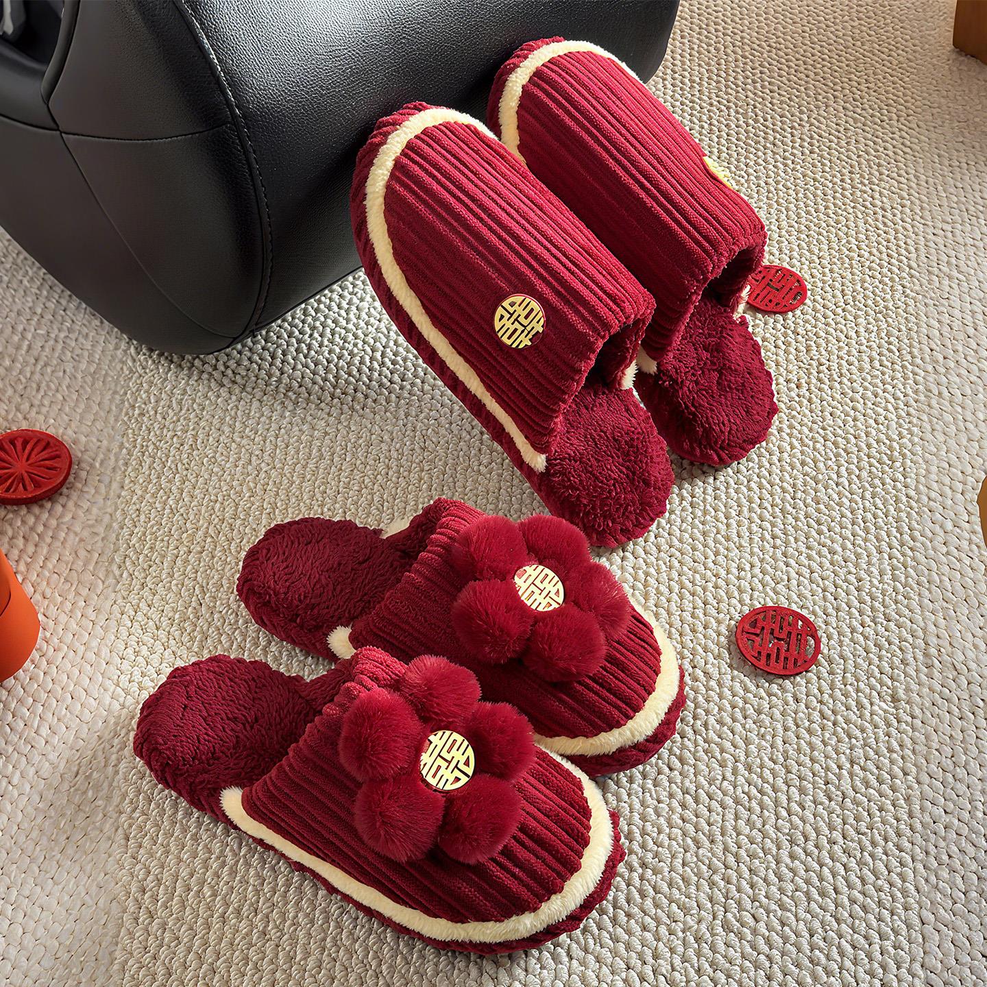 备婚的100个快递丨红色拖鞋结婚一对喜庆陪嫁情侣毛毛棉拖鞋冬季