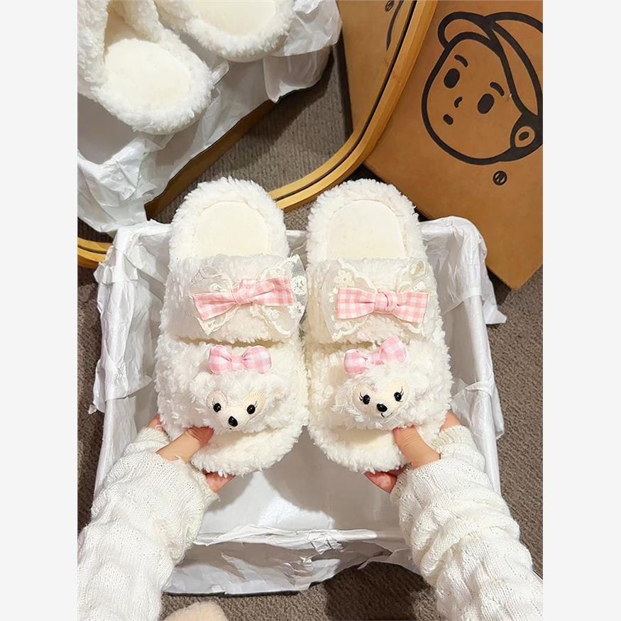 可爱小点点毛绒绒拖鞋女冬家居室内防滑软底棉拖鞋简约毛茸一字拖