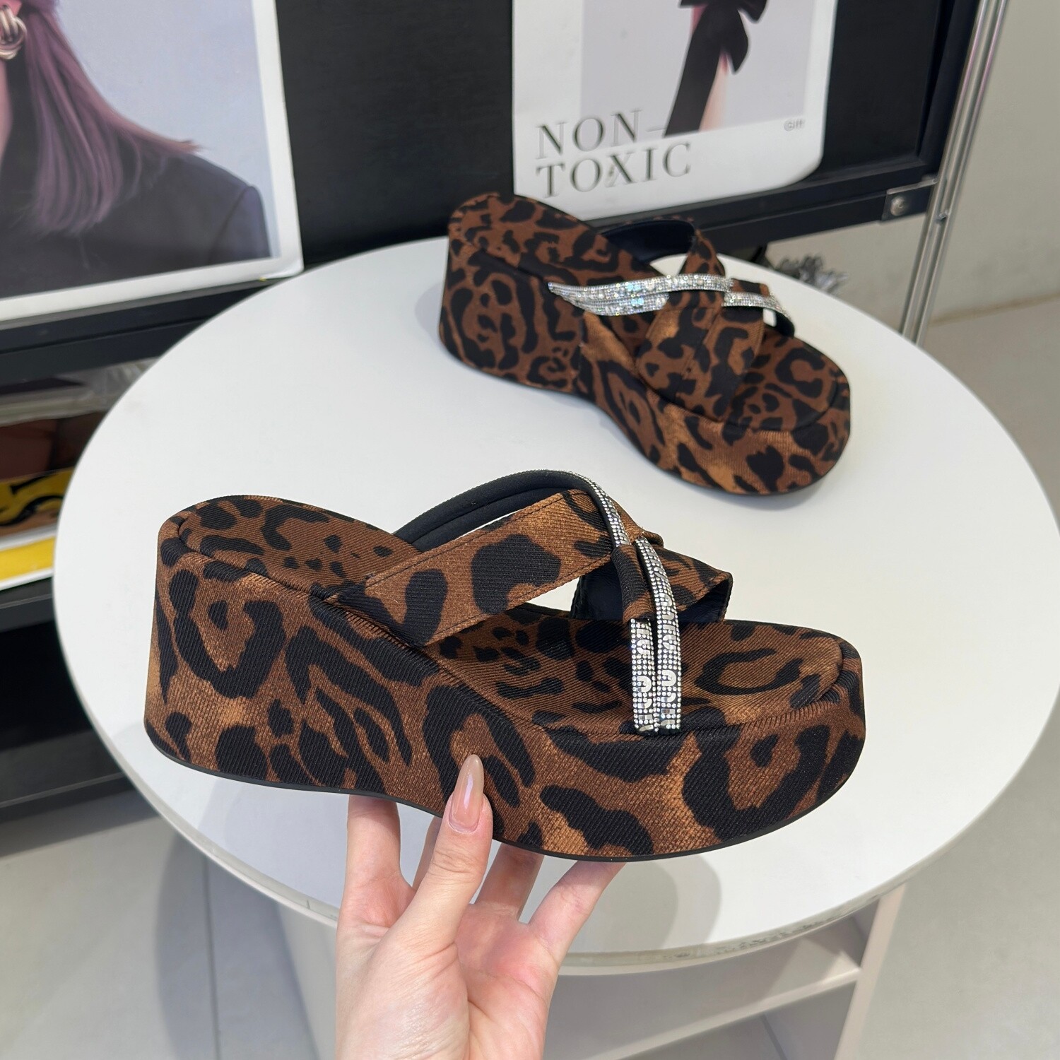 nnmiss/5cm优雅复古方头水钻异型坡跟外穿百搭时尚露趾凉拖鞋