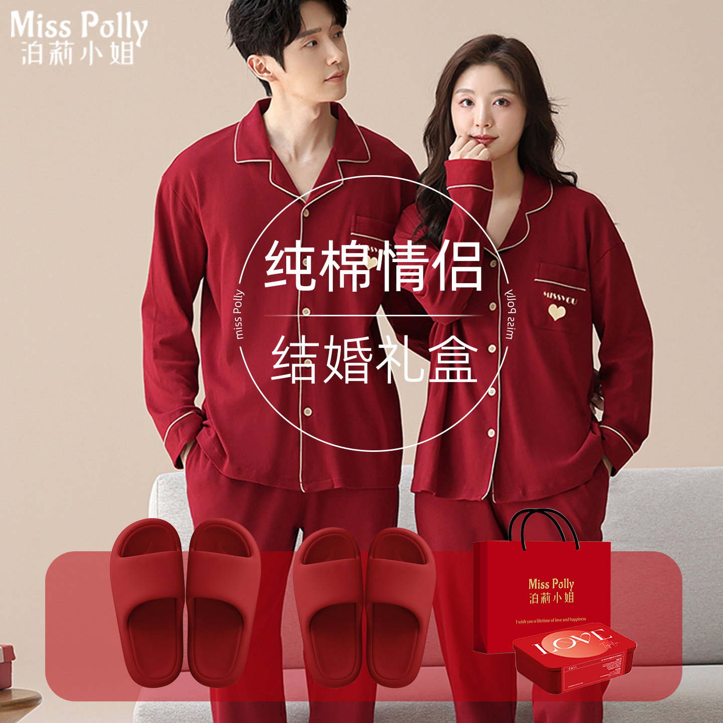 2套红色睡衣结婚新婚情侣套装纯棉一对拖鞋高级感春夏秋冬季大码
