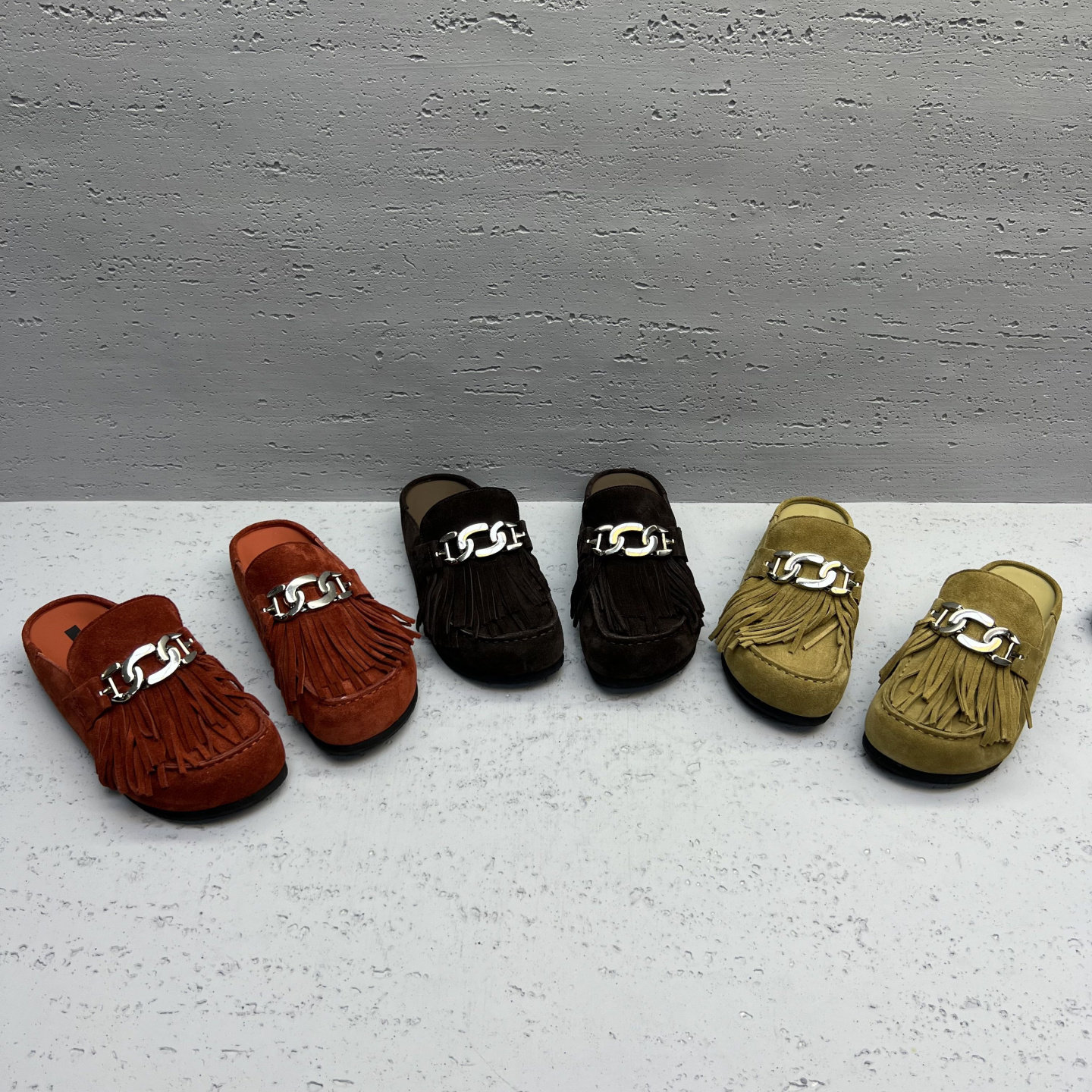 欧洲站2026春季款欧货真皮女鞋低跟平底流苏金属扣牛反绒包头拖鞋