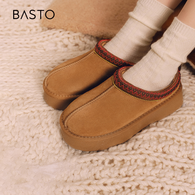 百思图冬新款真皮厚底加绒保暖雪地靴勃肯拖鞋棉鞋女L6728DM4