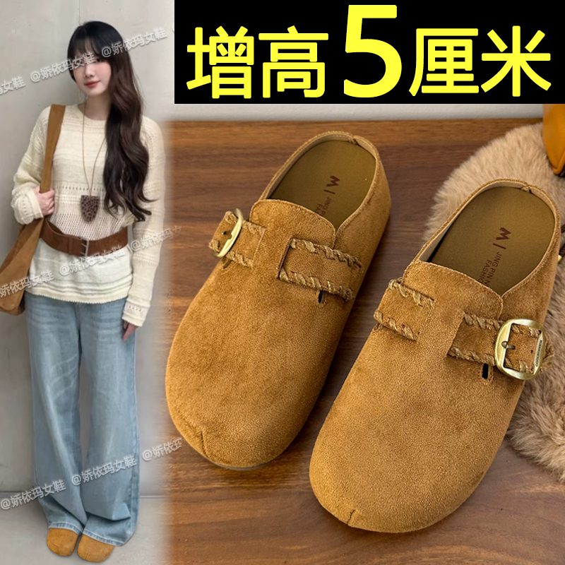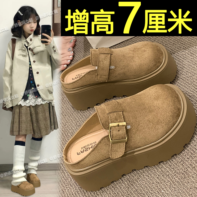 松糕勃肯鞋女外穿2025新款春秋季小个子厚底增高一脚蹬包头半拖鞋