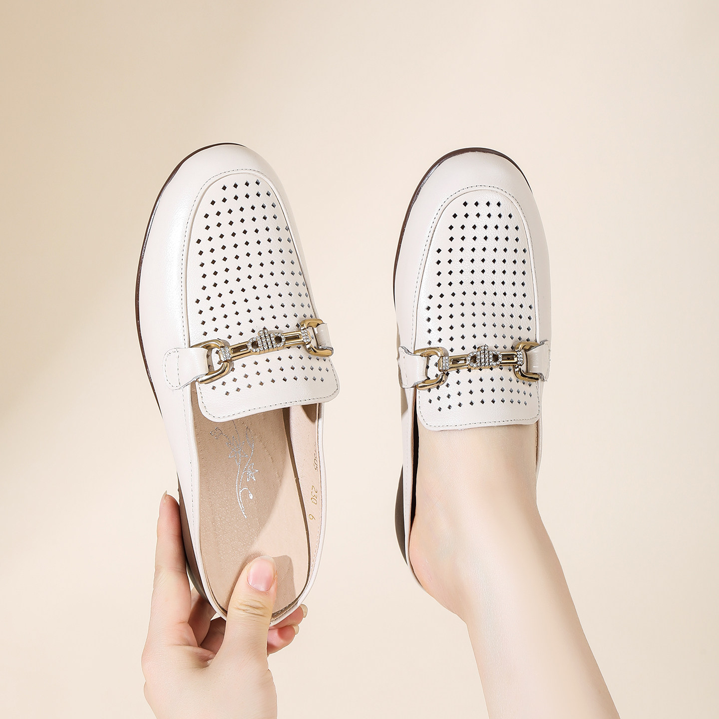 真皮包头坡跟凉拖鞋女夏季圆头软底妈妈鞋外穿懒人半拖镂空洞洞鞋