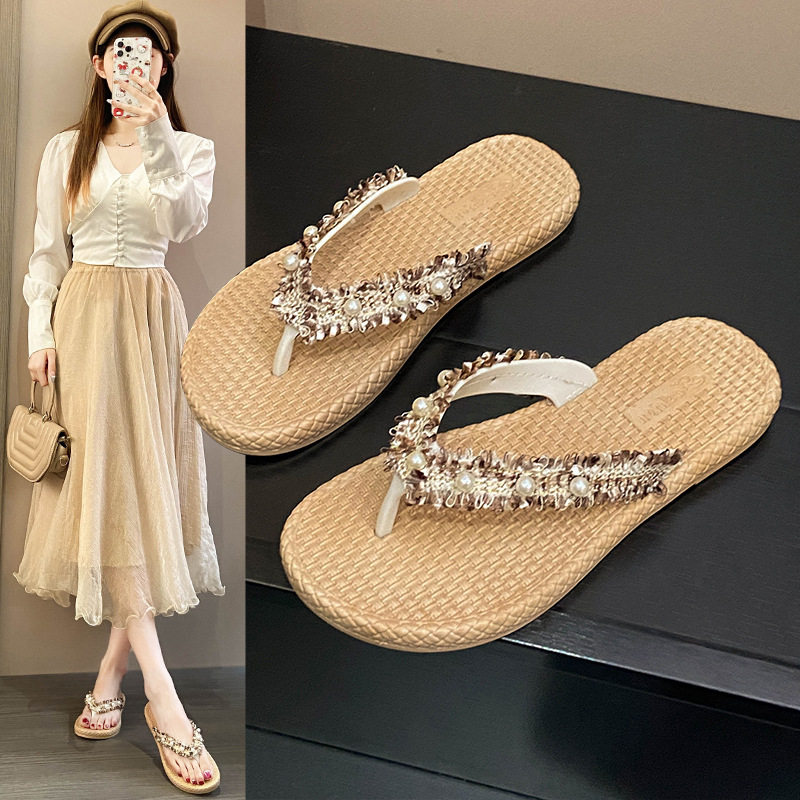 草编织亚麻平底人字拖珍珠水钻拖鞋夏季海边沙滩夹脚防滑小凉拖鞋