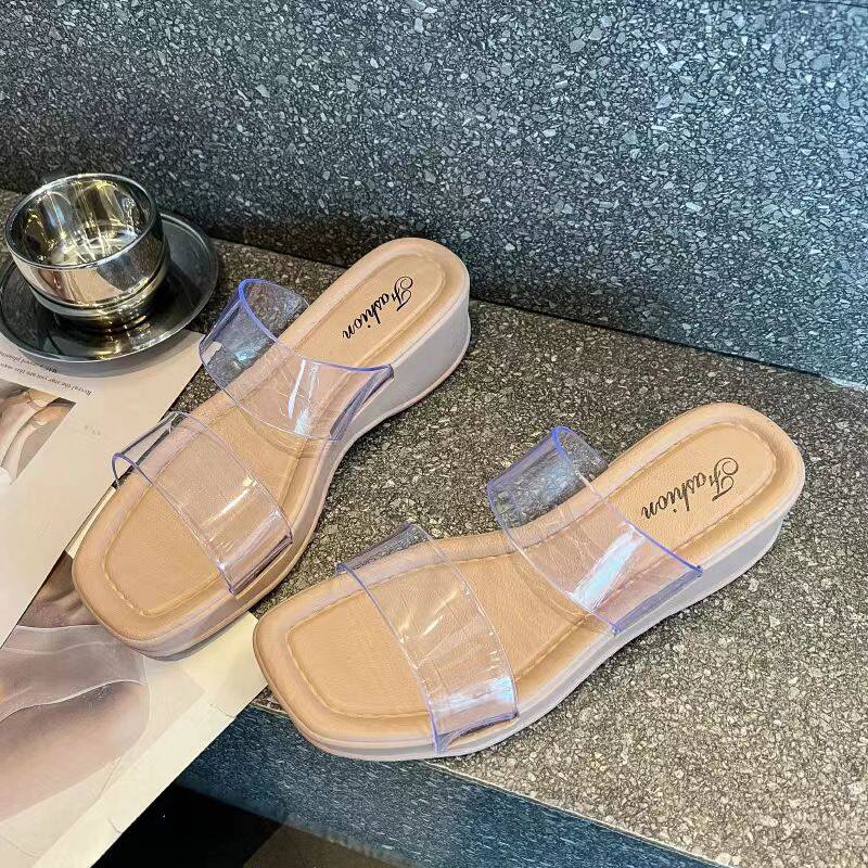 2026新款女拖鞋夏季时尚仙女风方头坡跟厚底拖透明百搭一字拖凉鞋