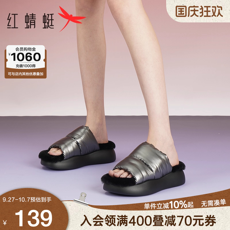 红蜻蜓厚底毛毛拖鞋秋冬新款女鞋外穿休闲一字拖舒适软底面包拖鞋