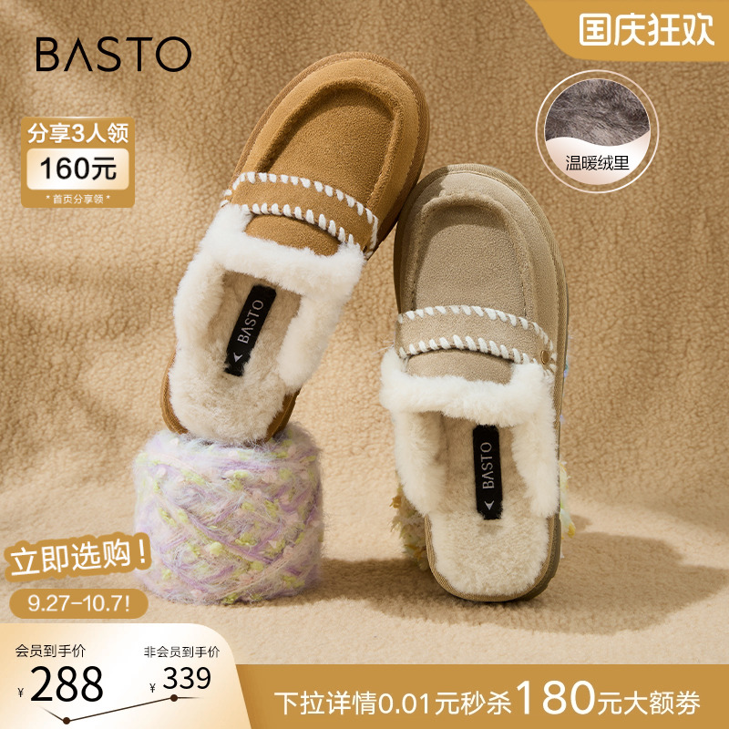 百思图冬季新款真皮休闲毛毛鞋厚底保暖外穿女拖鞋棉鞋BM207DH4