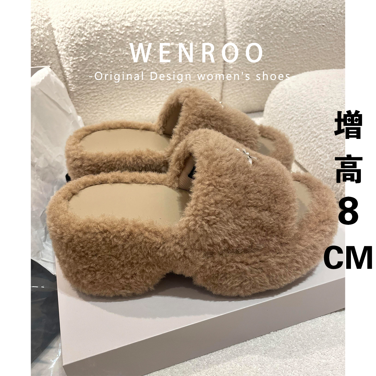 日本GP赵露思同款厚底毛毛拖鞋女2025秋冬新款小个子百搭半拖棉鞋