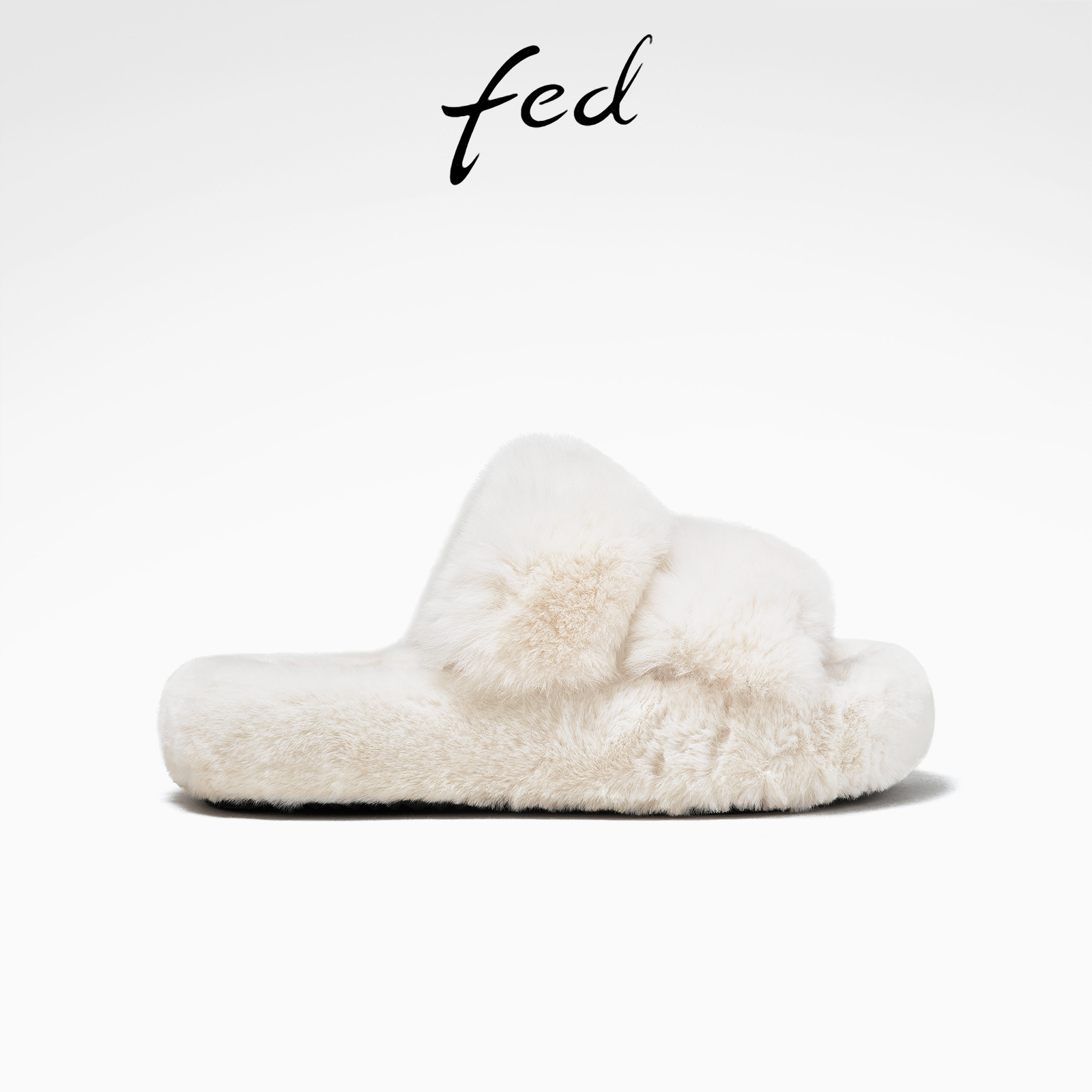 fed兔毛毛女鞋秋冬保暖厚底休闲一字毛绒拖鞋女外穿家居棉拖鞋女