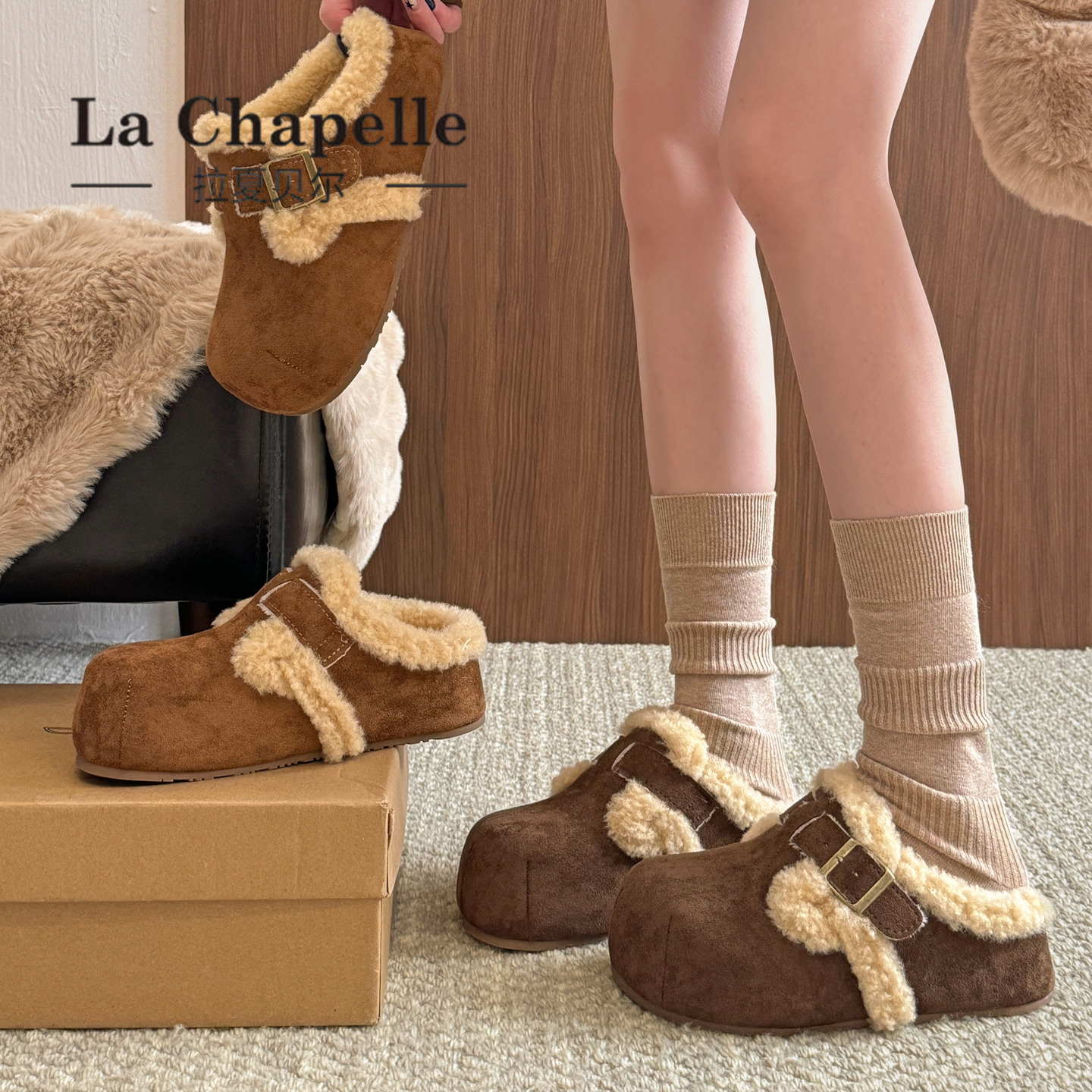 拉夏贝尔加绒勃肯鞋女2025新款秋冬季棉鞋加厚毛绒包头半拖鞋外穿