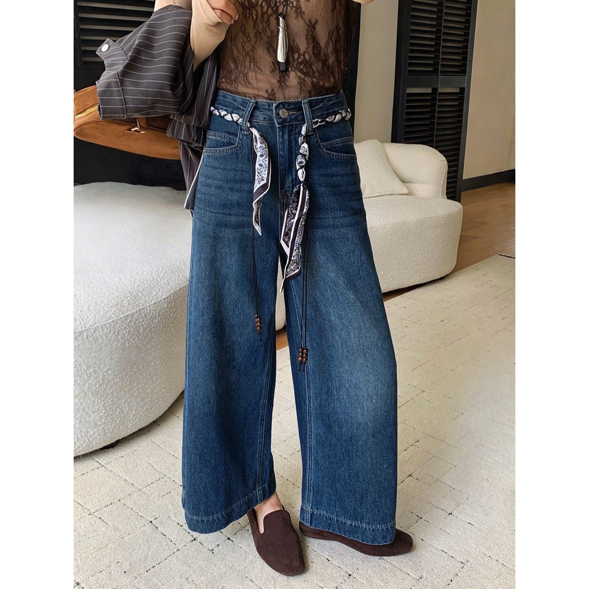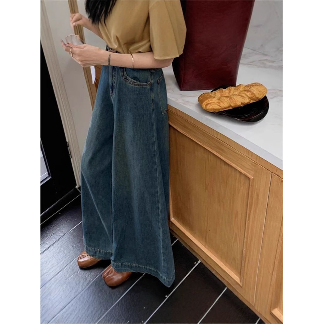 水洗复古甸蓝薄款亚文化阔腿牛仔扫地裤 象腿大裤脚秋装裤子女
