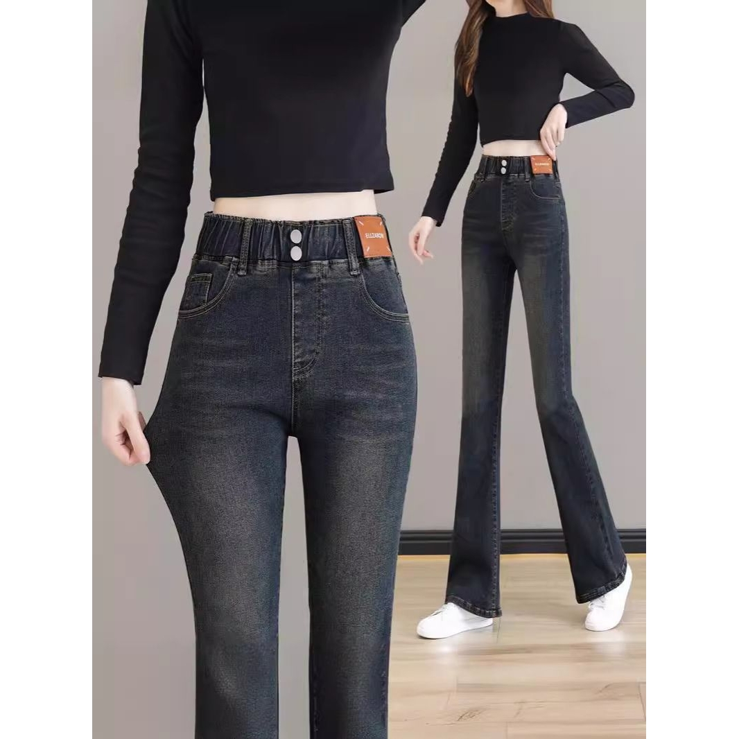 松紧腰微喇裤女大码牛仔裤2025春秋新款女士高腰休闲马蹄喇叭裤子