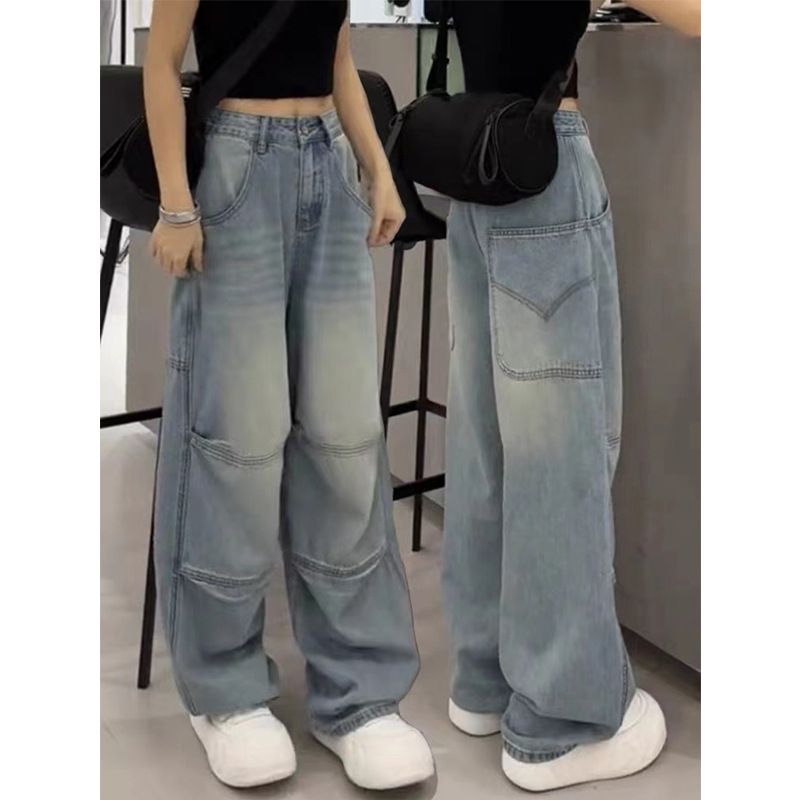 复古水洗设计感拼接阔腿牛仔裤女春季新款小个子高腰宽松直筒长裤