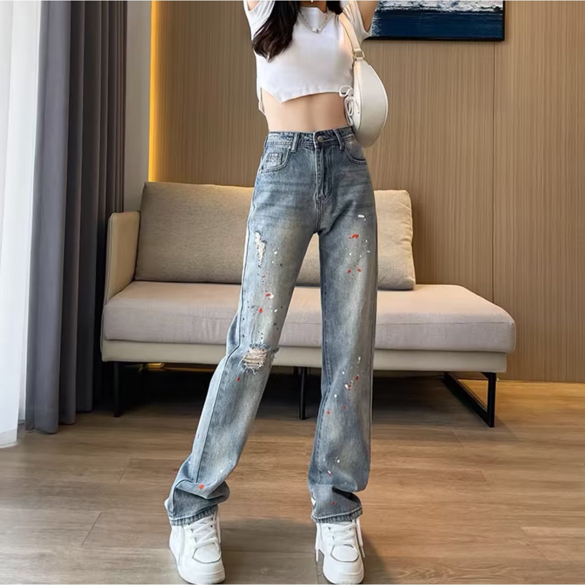 美式泼墨破洞牛仔裤女秋季设计感小个子新款高腰宽松显瘦直筒裤潮