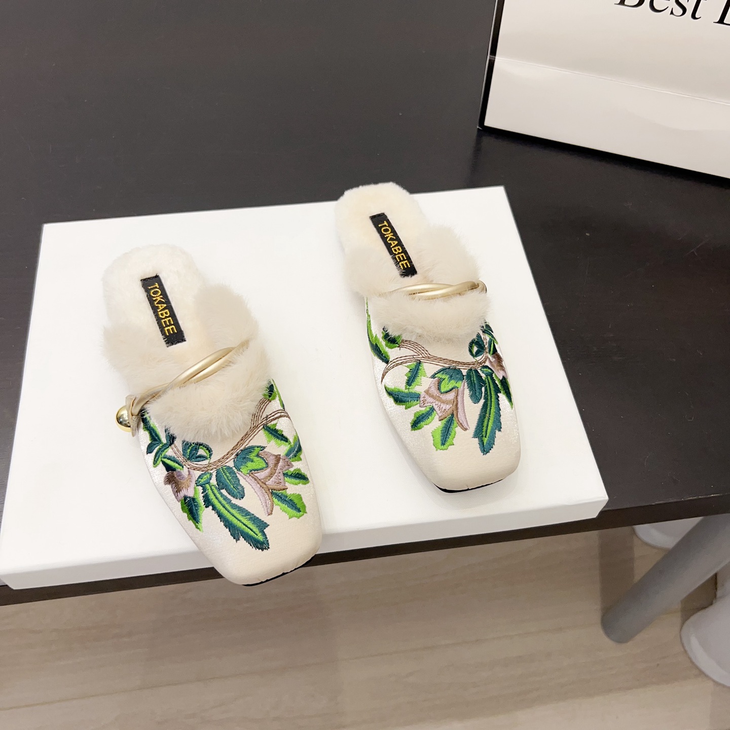 新中式包头刺绣毛毛鞋女2025秋冬新款加绒保暖平底外穿包头半拖鞋