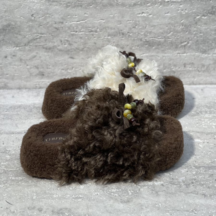 欧洲站女鞋2025秋冬新款欧货真毛羊卷毛蝴蝶结厚底毛毛鞋拖鞋女潮