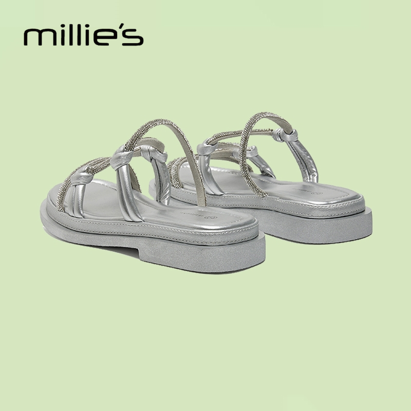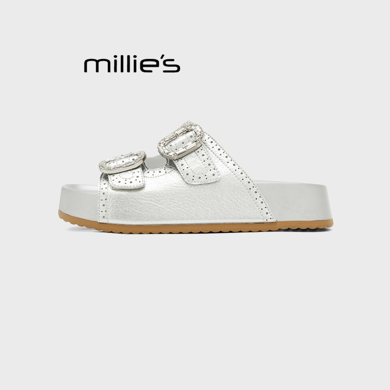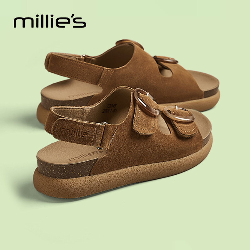MILLIE'S/妙丽2025夏季新款真皮厚底勃肯鞋女鞋皮带扣休闲风拖鞋