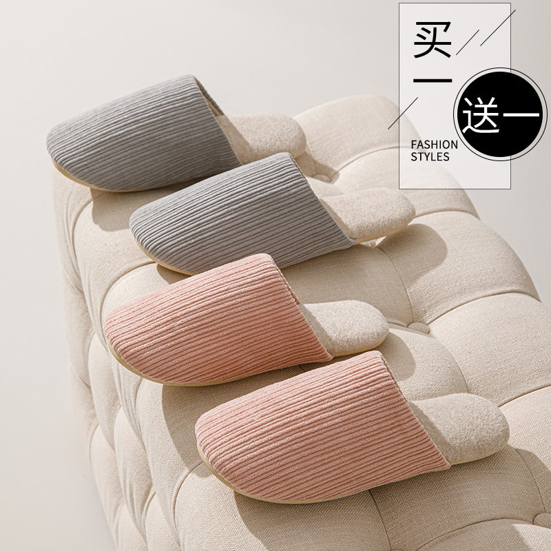 买一送一情侣条纹地板拖女士秋冬季室内居家防滑舒适柔软棉拖鞋男