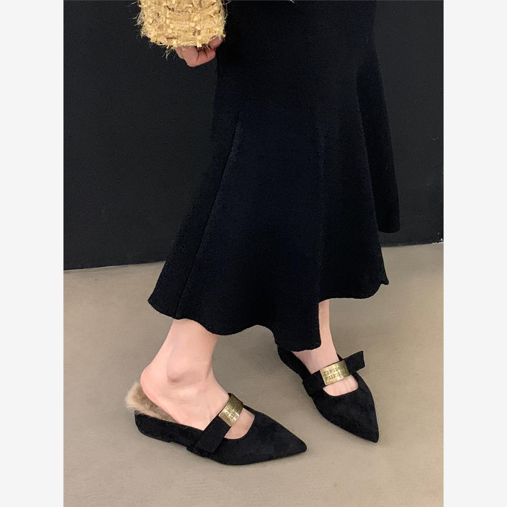 羊皮版~尖头毛毛鞋女外穿加绒包头半拖鞋内增高覆古金属浅口单鞋
