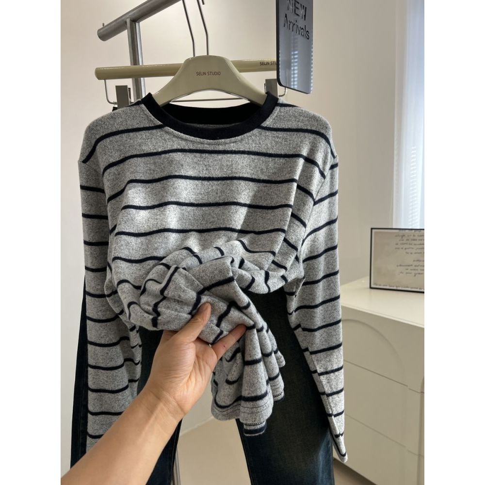 磨毛加厚慵懒撞色条纹长袖t恤女秋季新款胖妹妹大码显瘦上衣