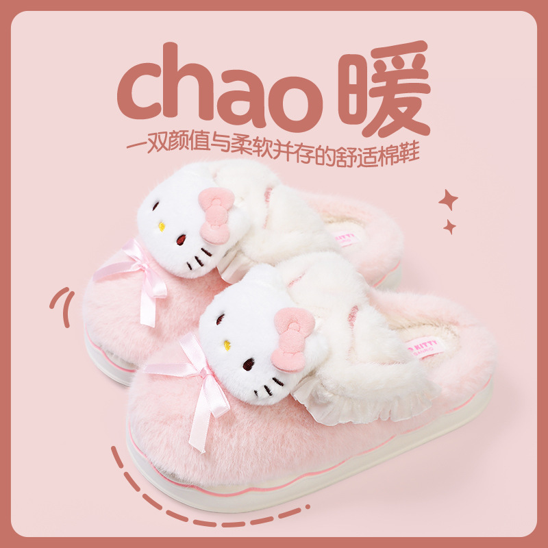 三丽鸥KT猫棉拖鞋女秋冬季可爱亲子保暖室内防滑毛绒包头拖鞋EVA