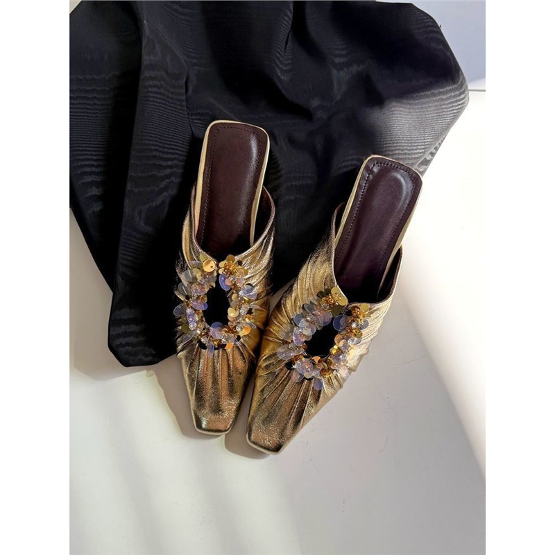 博主同款~轻奢风真皮法式亮片镂空坡跟包头凉鞋夏日半拖鞋女外穿