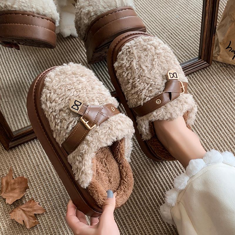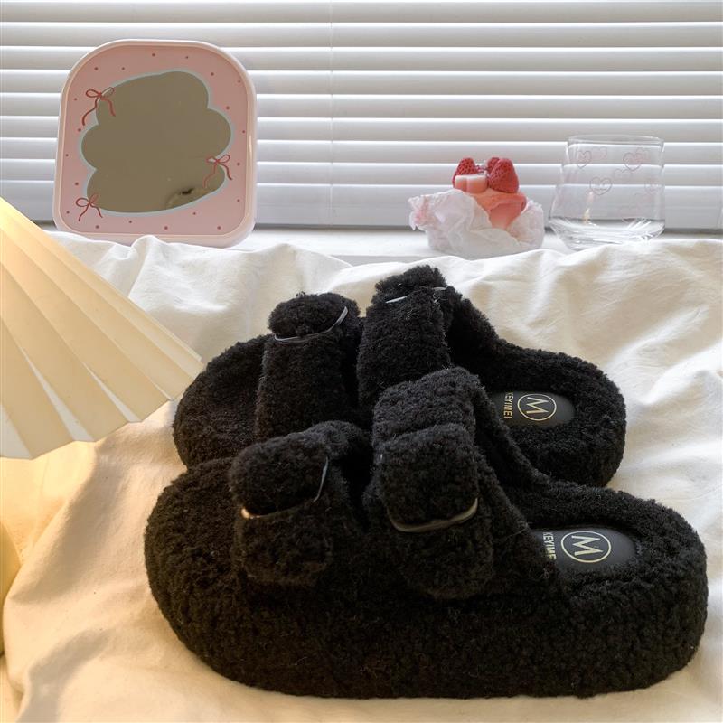 现货毛绒一字扣勃肯棉拖鞋女外穿2025秋冬新款温柔仙女风厚底毛毛