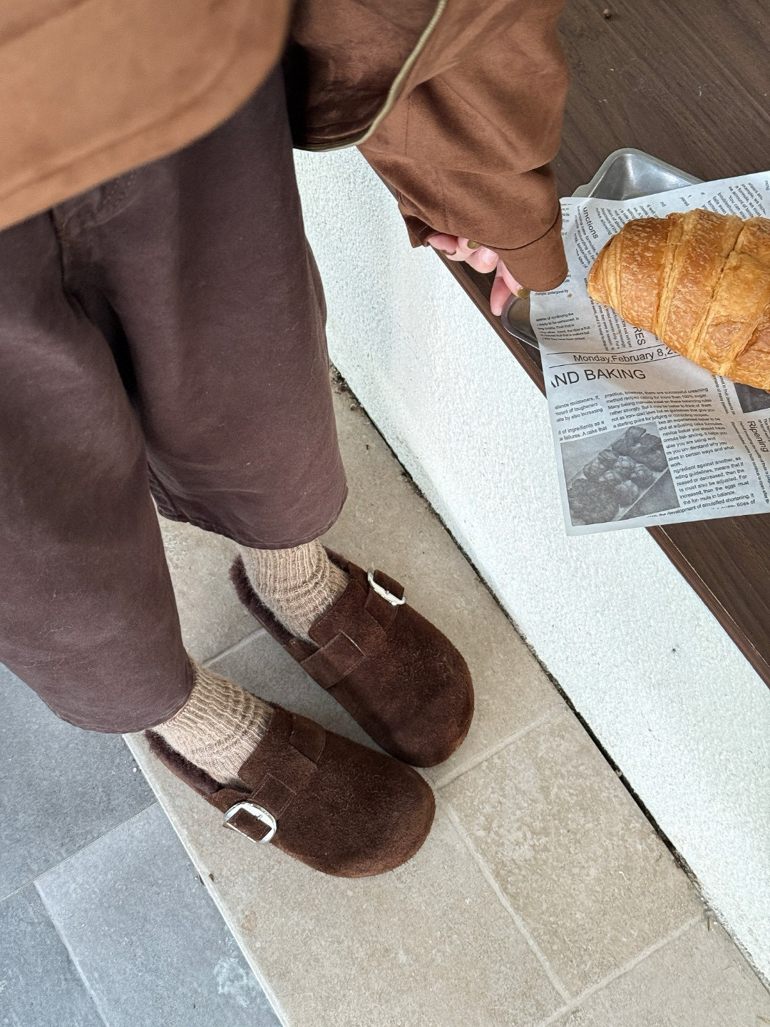 布洛克真皮厚底加绒包头半拖鞋女外穿2025秋冬新款复古毛毛勃肯鞋