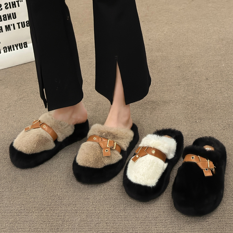 韩国秋冬新款法式复古女童洋气外穿毛毛鞋羊羔毛拖鞋小众加绒拖鞋