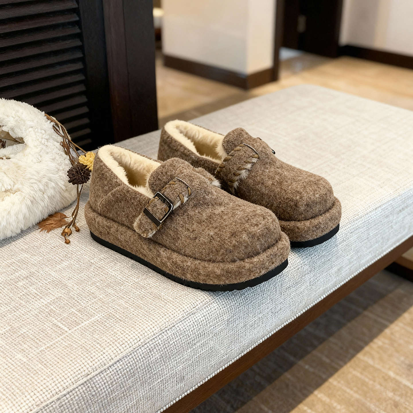冉言毛呢小面包~厚底毛毛包头勃肯拖鞋女乐福鞋单鞋