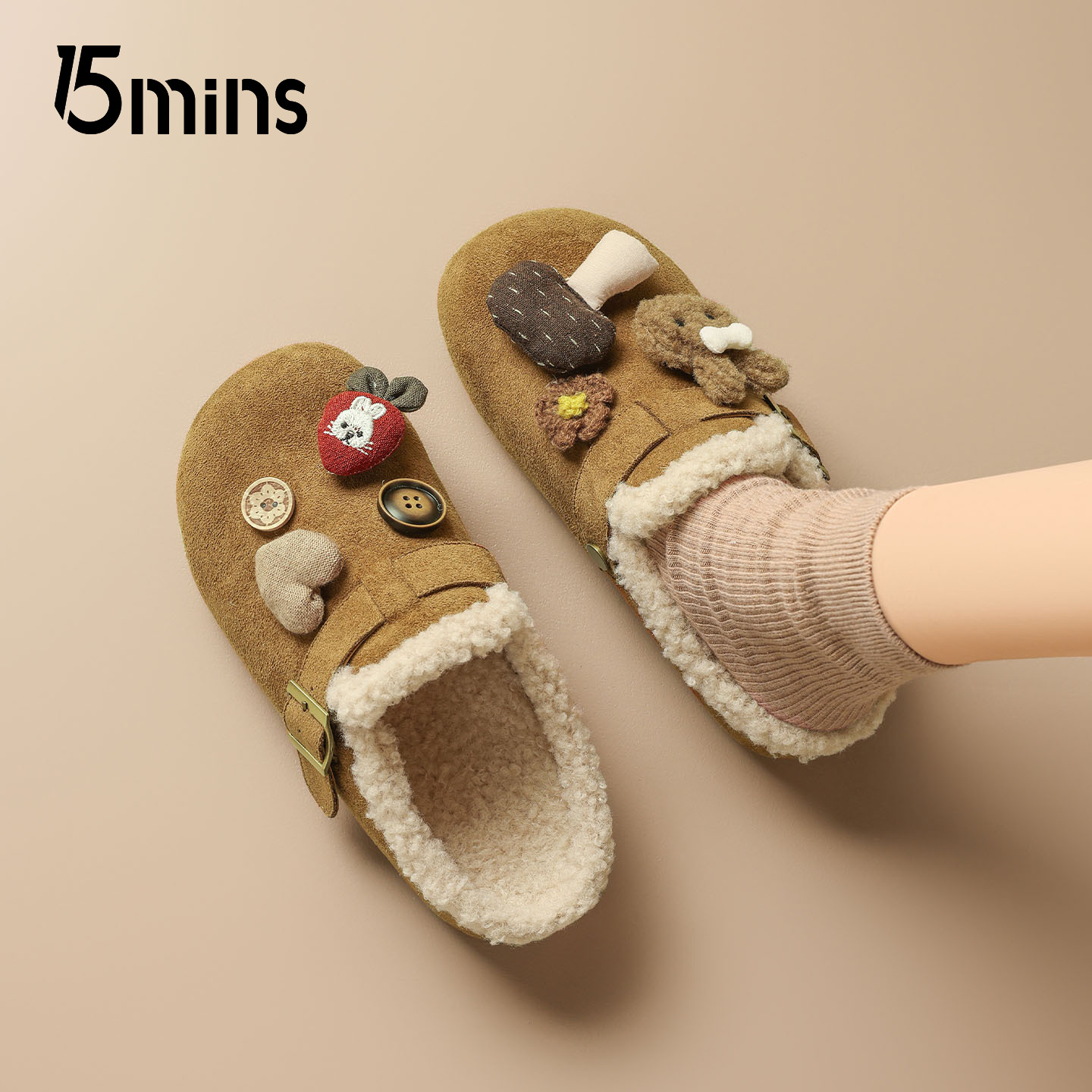 15mins加绒勃肯拖鞋女2025冬季新款外穿毛毛保暖半拖一脚蹬懒人鞋
