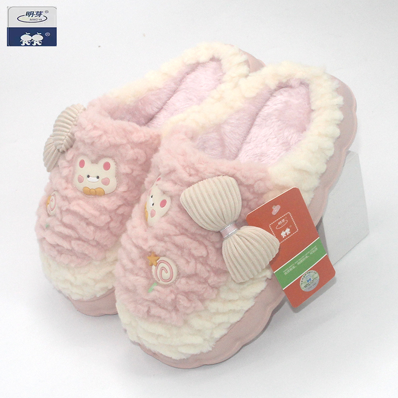 秋冬季明芽棉拖鞋蝴蝶结可爱情侣家用拖鞋厚底防滑防臭男女童毛拖