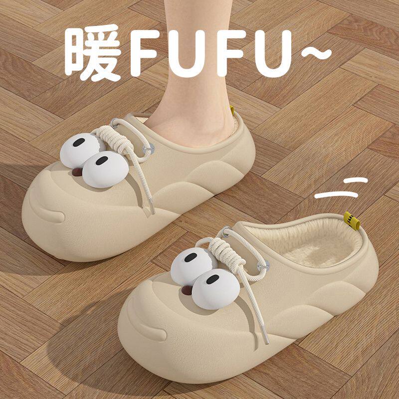 大眼防水棉拖鞋女秋冬可外穿家居防滑加绒保暖厚底踩屎感包跟棉鞋
