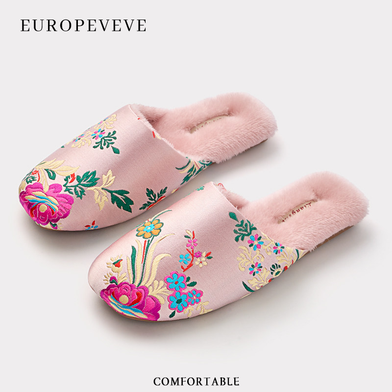秋冬季女士绣花绸缎棉拖鞋居家室内中国民族风防滑毛绒保暖拖鞋女