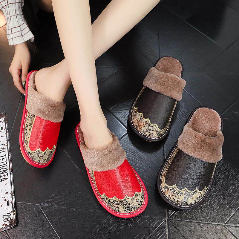 高级羊巴皮防水PU皮革情侣棉拖鞋女家用加绒牛筋底居家客厅男冬季
