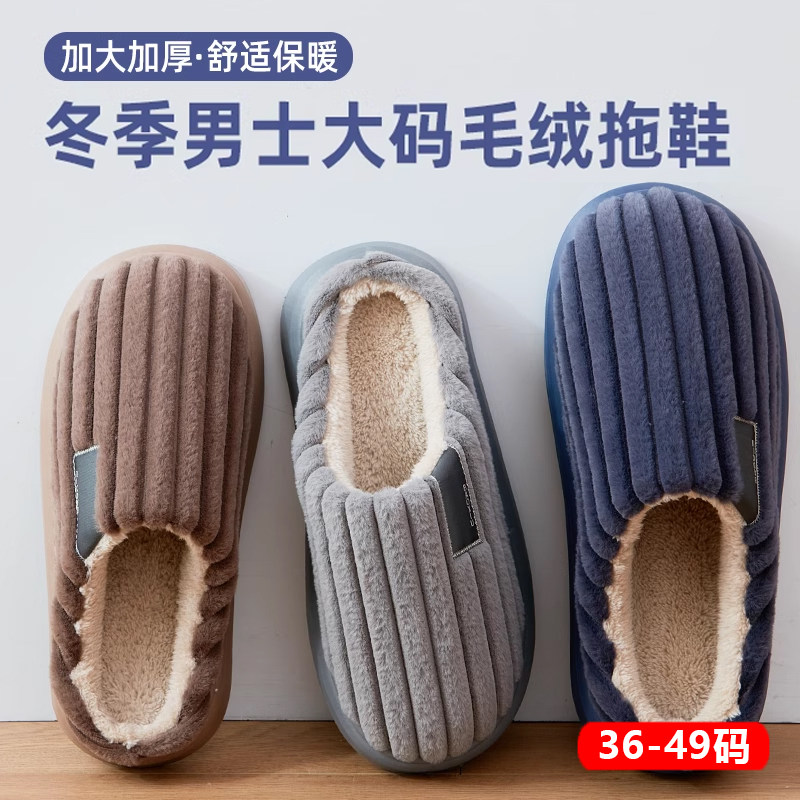 包跟棉拖鞋冬季女大码防滑u厚底毛绒保暖男士条纹家居家用棉鞋男
