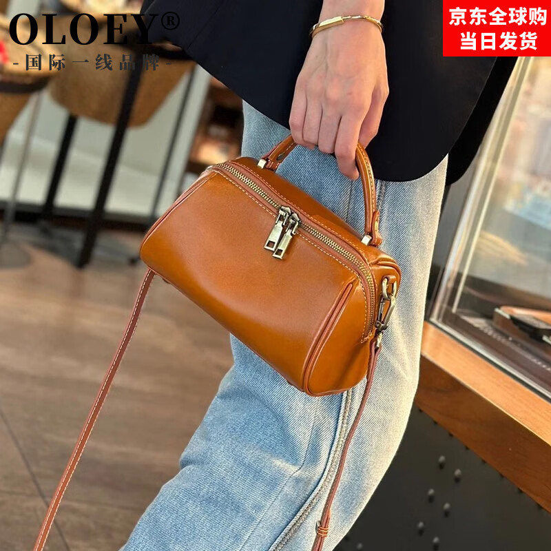 OLOEY国际一线品牌头层牛皮包包女式2025新款波士顿枕头包女士单肩小包 焦糖色【头层牛皮】肩带可调节
