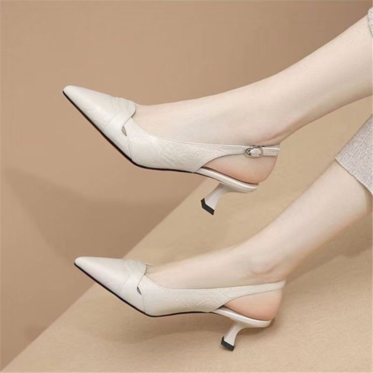 真皮包头凉鞋女夏季2025新款法式尖头细跟高跟鞋后空一字扣带