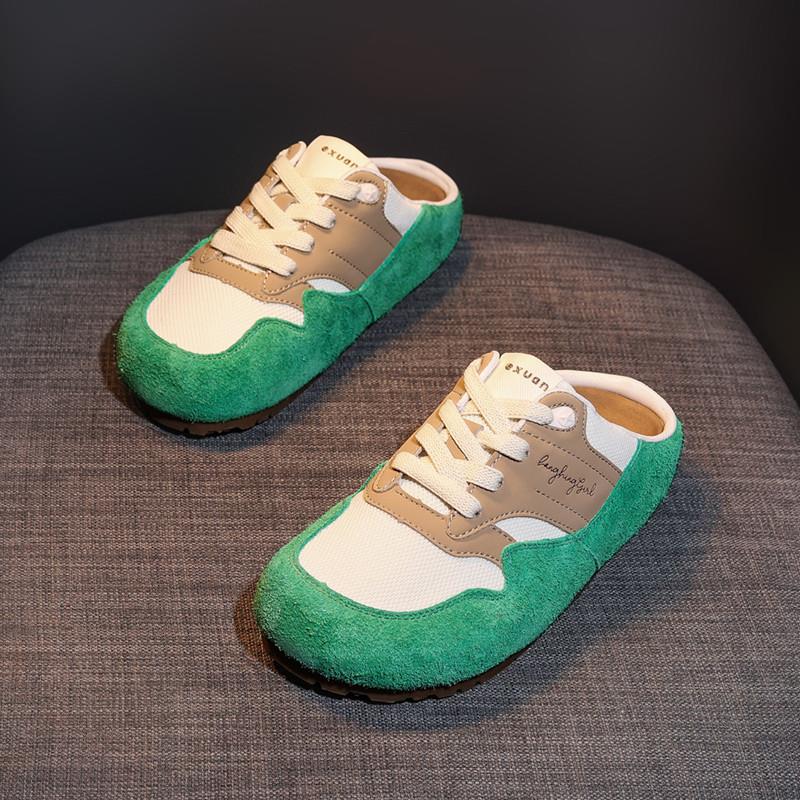 新品透气一脚蹬半拖鞋女2025夏季新款复古真皮包头拖鞋网面懒人拖