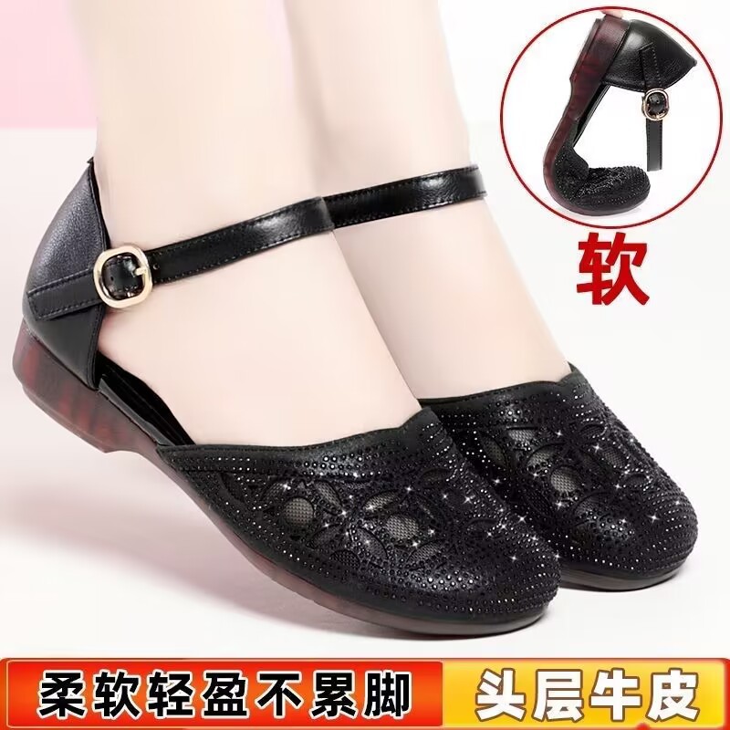 品牌2025夏季新款防滑妈妈鞋软底一字扣百搭单鞋女真皮包头凉鞋