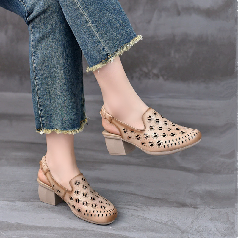 真皮包头凉鞋女粗跟软底妈妈鞋镂空透气洞洞鞋时尚气质罗马单鞋女